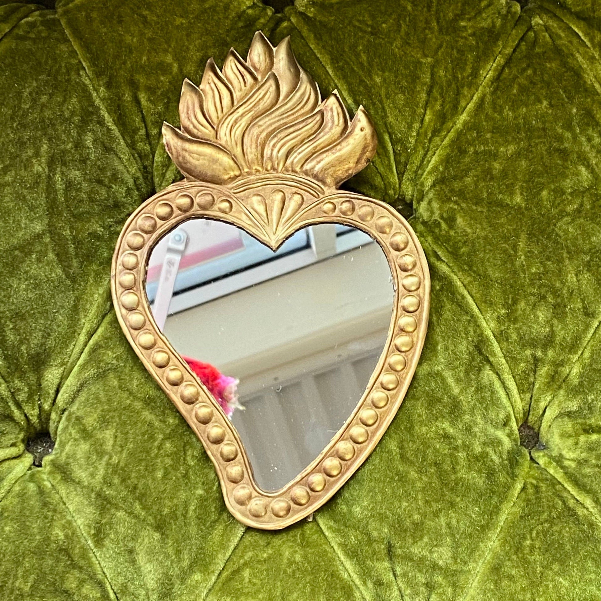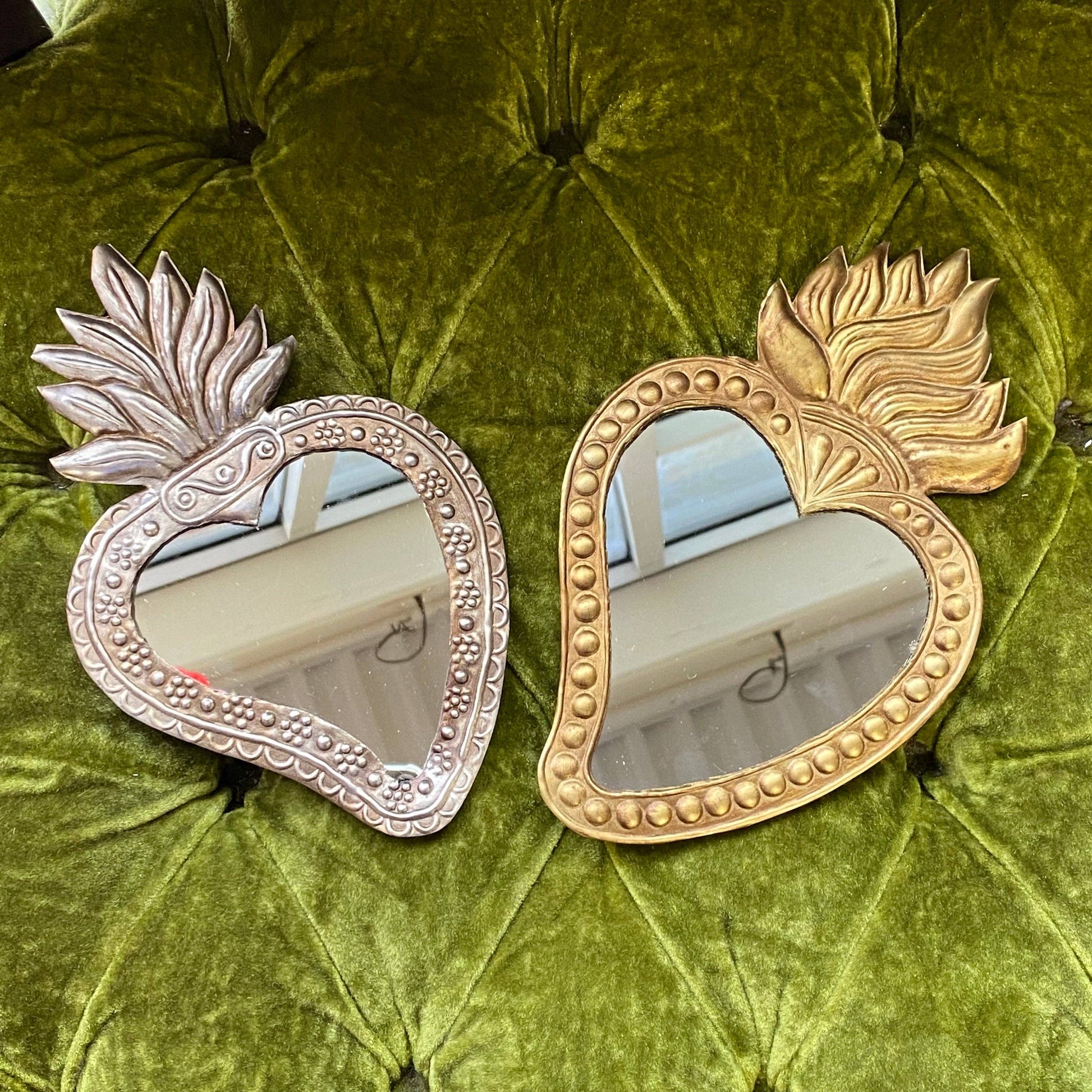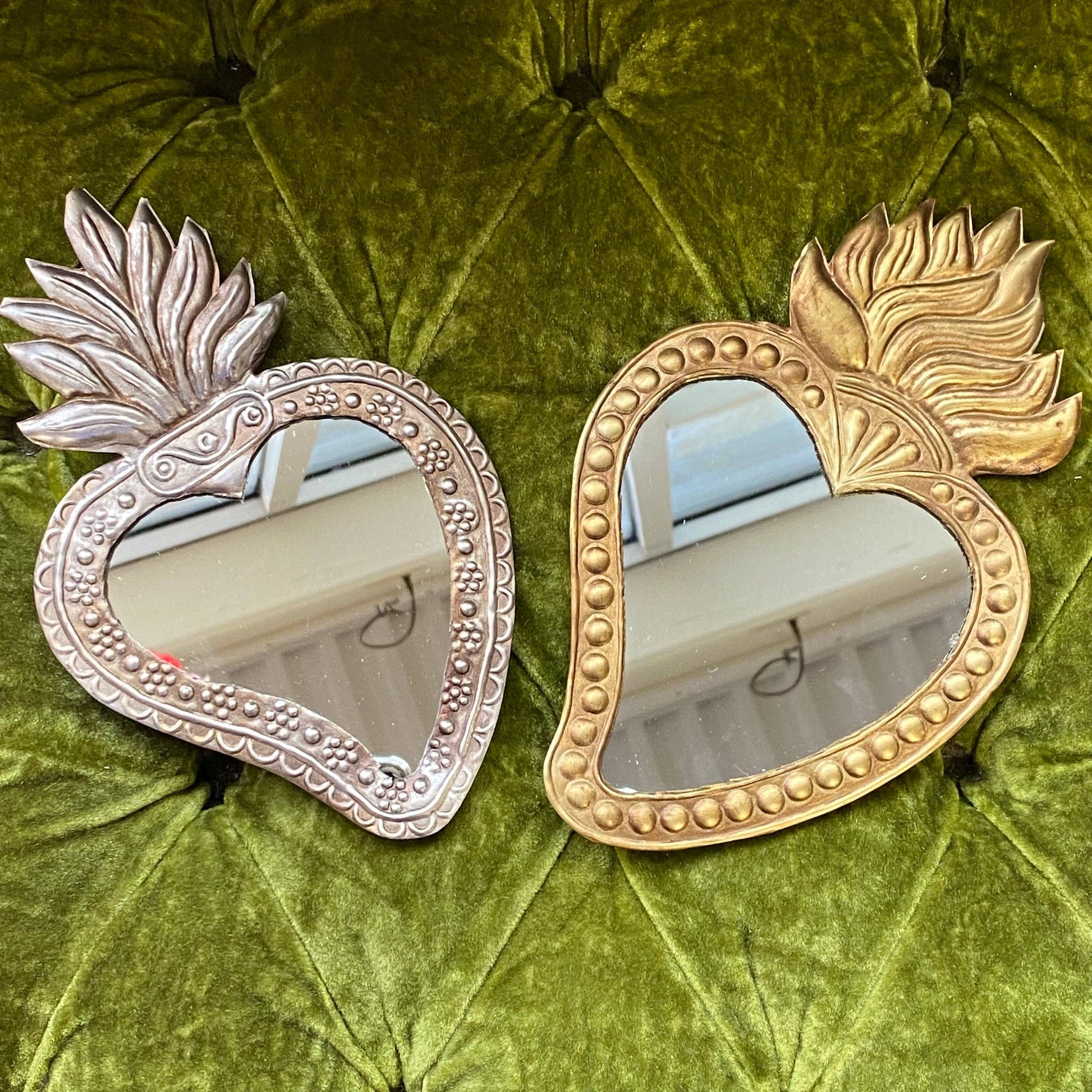 Miroir Sacré-Cœur en argent antique de 8,5 « x 5,5 pouces » avec pois floraux ou miroir Sacré-Cœur doré avec points.