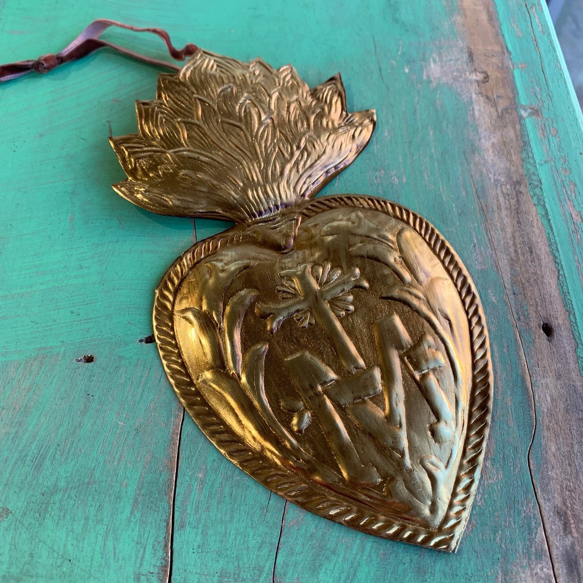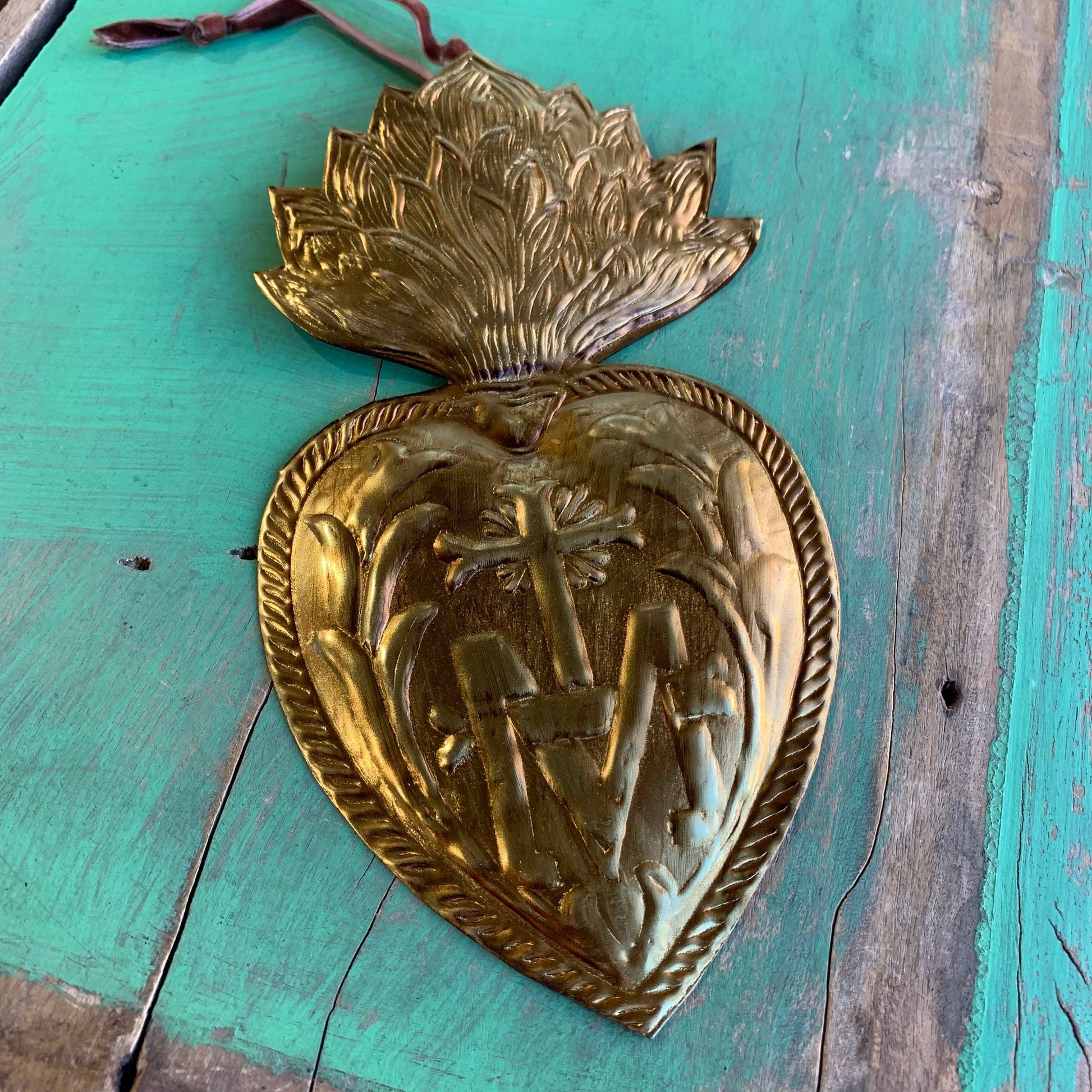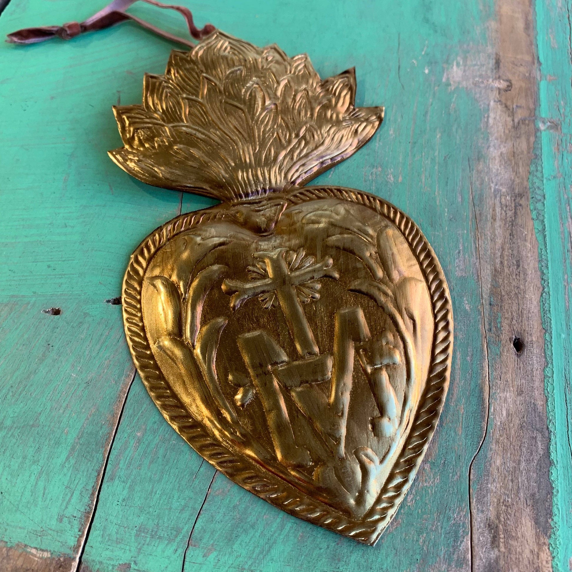 Ornement en étain de 12 x 6,5 pouces avec l'emblème qui signifie « À Jésus par Marie ».